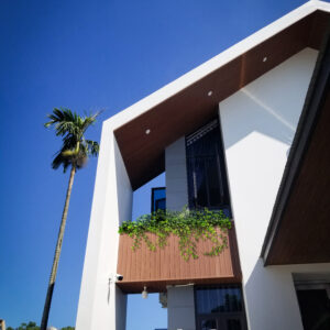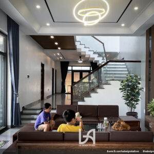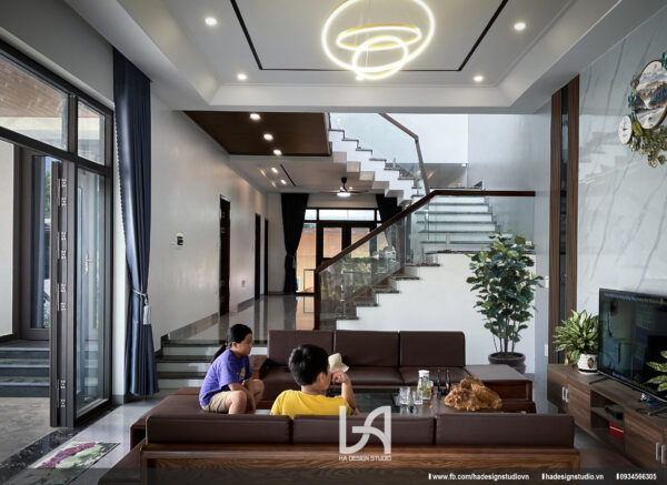 Chủ đầu tư là 2 vợ chồng giáo viên sống cùng 3 con nhỏ muốn có một không gian sống mới mẻ, hiện đại và gần gũi với thiên nhiên nhưng vẫn đảm bảo được sự riêng tư. Công trình có mặt chính hướng Tây Bắc, chịu thời tiết nắng nóng buổi chiều. Giải pháp sử dụng hệ mái sảnh khẩu độ lớn, tạo bóng đổ cho khối tầng 1 vốn được thiết kế hệ vách kính rộng. Ở khối tầng 2, khối thang và không gian công cộng được đưa ra mặt trước, ưu tiên che chắn cho khối phòng ngủ phía sau đồng thời sử dụng tường ngăn 2 lớp vừa tạo khối , vừa làm giảm nhiệt độ bên trong công trình. Công trình sử dụng hàng hiên, mái sảnh như các ngôi nhà nhiệt đới truyền thống, nhằm tạo ra khoảng không gian đệm chuyển tiếp giữa trong và ngoài nhà thành các lớp lang trong không gian sử dụng.