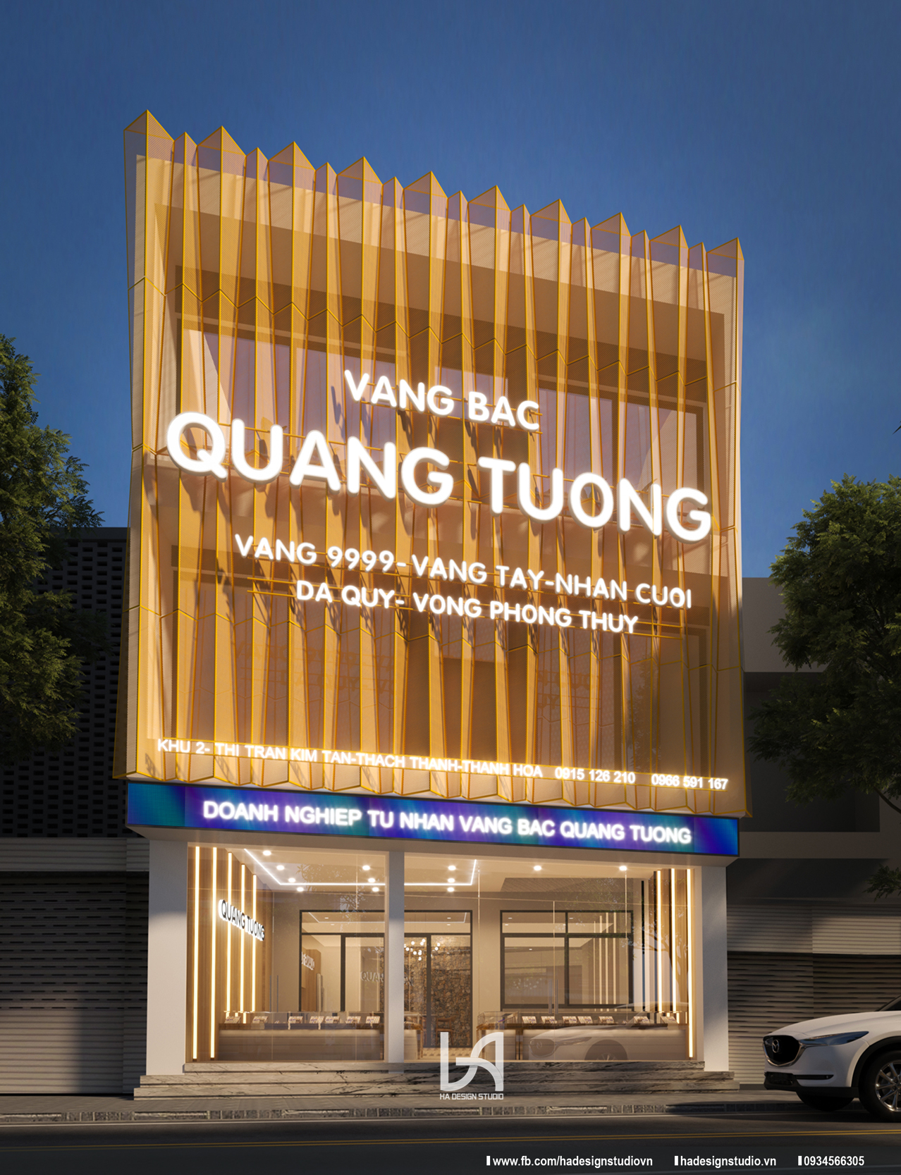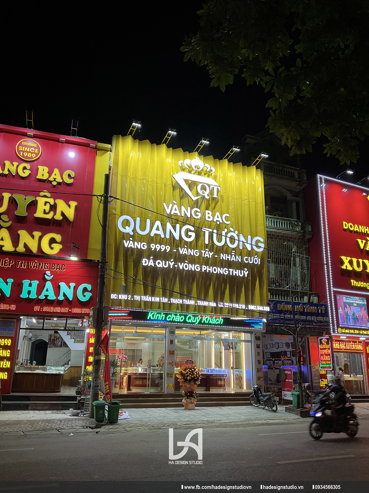Công trình nằm trong một khu phố kinh doanh sầm uất, đặc biệt với hàng loạt cửa hàng vàng bạc san sát nhau.Một đề xuất khá mạo hiểm của chúng tôi đối với chủ đầu tư khi là hãy thay đổi màu sắc biển quảng cáo vàng bạc truyền thống, thường là tone màu đỏ, chữ vàng sang tone màu vàng , chữ trắng tạo ra sự khác biệt khi nhận diện thương hiệu.Đồng thời hệ thống biển quảng cáo được làm từ thép đục lỗ thành một hệ lam cách điệu các đường nét gấp khúc được lấy cảm hứng từ những viên kim cương vẫn đảm bảo vấn đề về thông gió và chiếu sáng tự nhiên cho công trình.Thật may mắn đề xuất của chúng tôi đã được chủ đầu tư chấp thuận và thi công thực tế.
